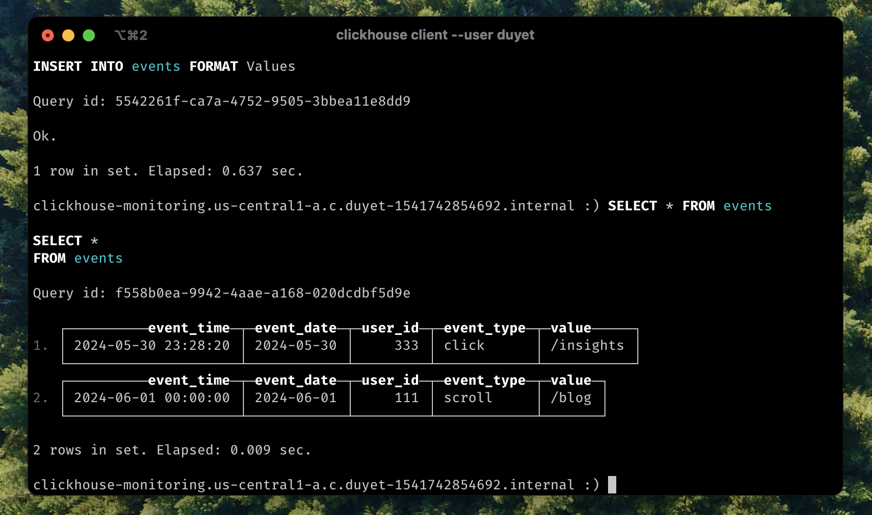 INSERT INTO events VALUES (now(), DEFAULT, 333, 'click', '/insights')