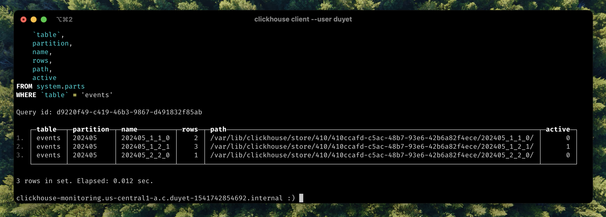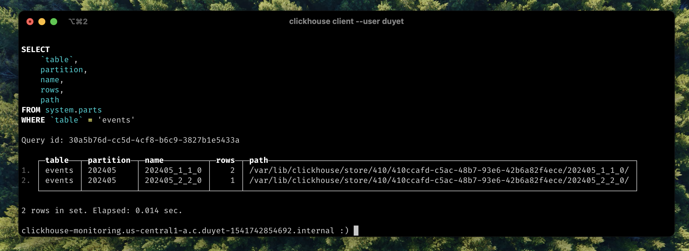 │ events │ 202405 │ 202405_1_1_0 │ 2 │ /var/lib/clickhouse/store/410/410ccafd-c5ac-48b7-93e6-42b6a82f4ece/202405_1_1_0/ │